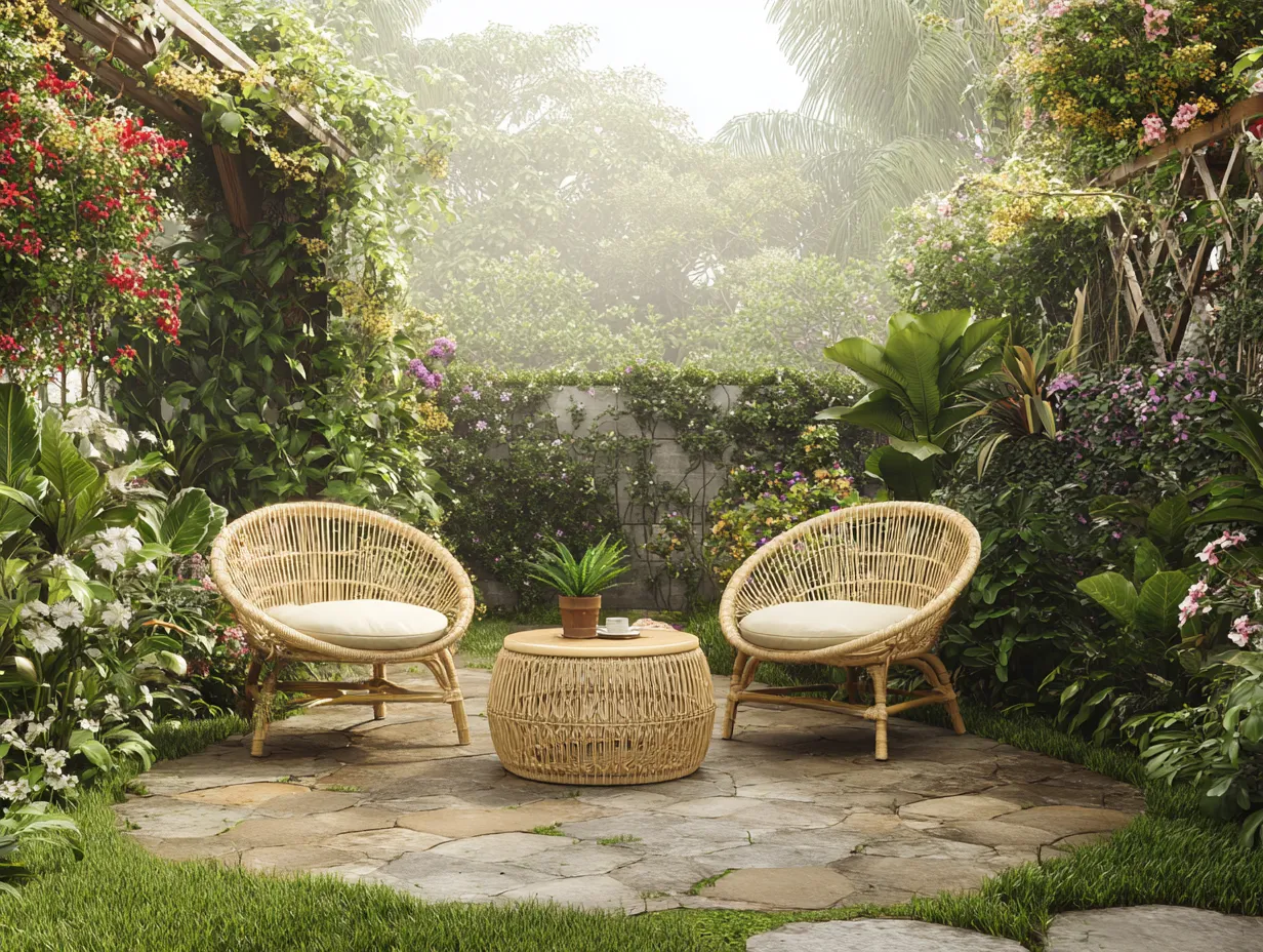 Cette sélection présente des salons de jardin élégants et naturels, composés de fauteuils confortables et de tables assorties. Les matériaux comme le rotin naturel, la résine tressée, le bois et le métal créent une ambiance chaleureuse. Idéals pour terrasse, balcon ou jardin, ils allient design, détente et convivialité pour profiter des beaux jours.